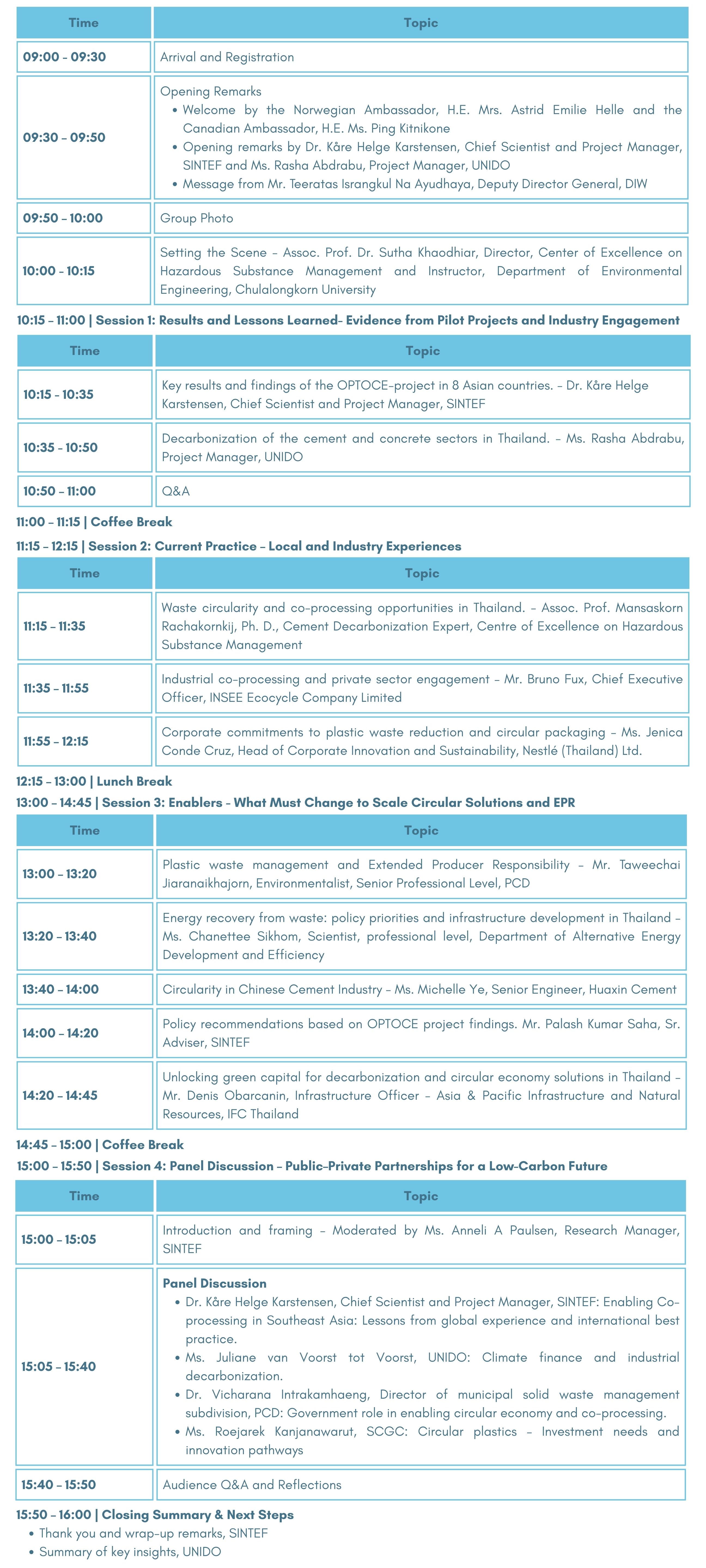 This joint workshop, hosted by SINTEF and UNIDO, brings together government, industry, development partners and international experts to accelerate circular economy and low-carbon strategies in Thailand and the region. It builds on outcomes from the OPTOCE project and UNIDO’s decarbonization programs, focusing on solutions for non-recyclable plastic waste, co-processing in cement kilns, and emission reduction. Participants will exchange insights on EPR implementation, regulatory reforms, industry engagement, and scalable waste-to-resource models. The workshop aims to drive policy uptake, enable regional collaboration, and strengthen public–private partnerships to scale pilot initiatives into scalable, sustainable action.