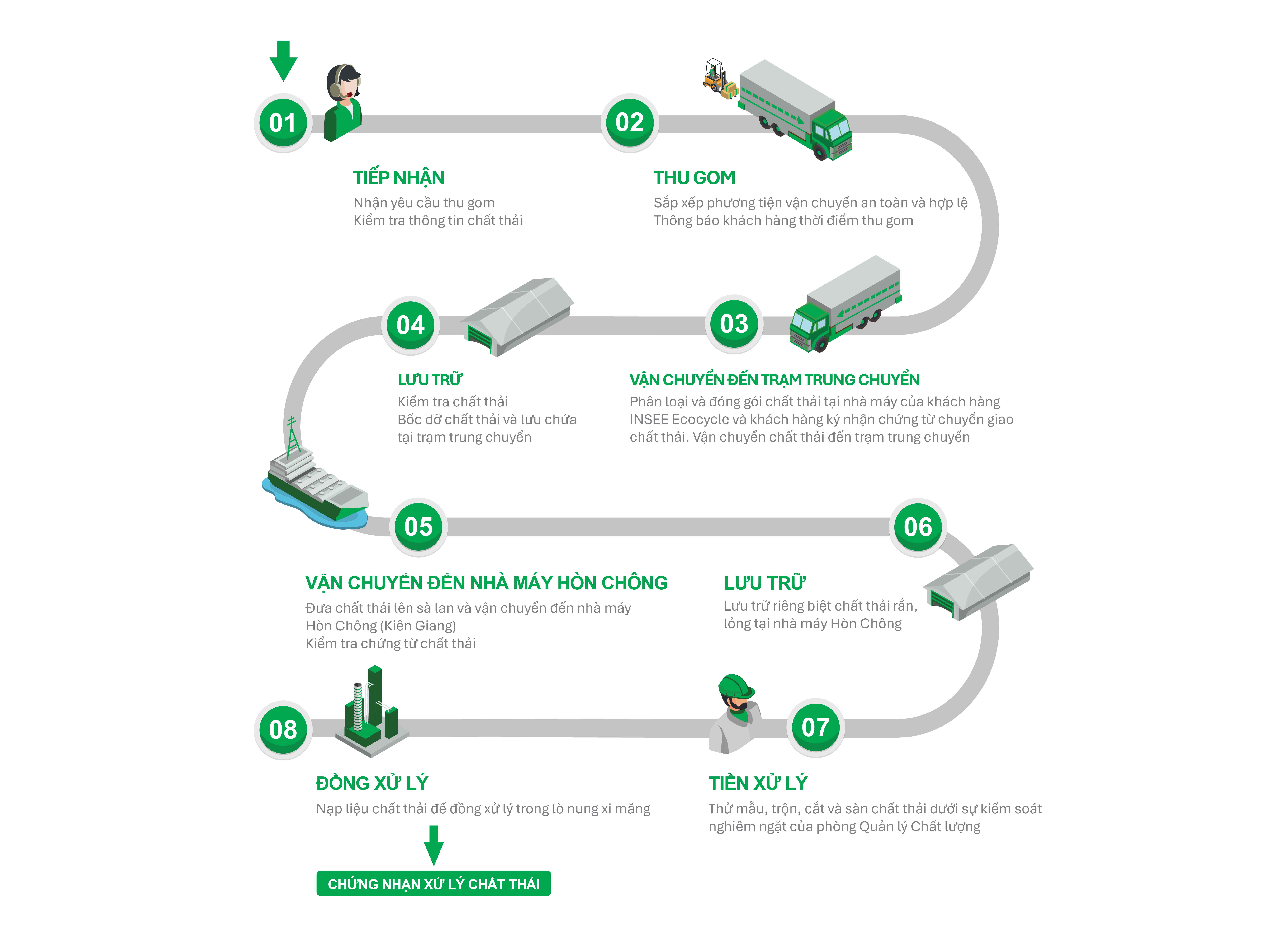 Đội ngũ của INSEE Ecocycle đồng hành cùng khách hàng để xây dựng giải pháp xử lý chất thải toàn diện – từ đánh giá, tư vấn đến tiêu hủy triệt để – đảm bảo phù hợp với đặc thù phát sinh chất thải của từng doanh nghiệp, tối ưu hiệu quả và tuân thủ quy định