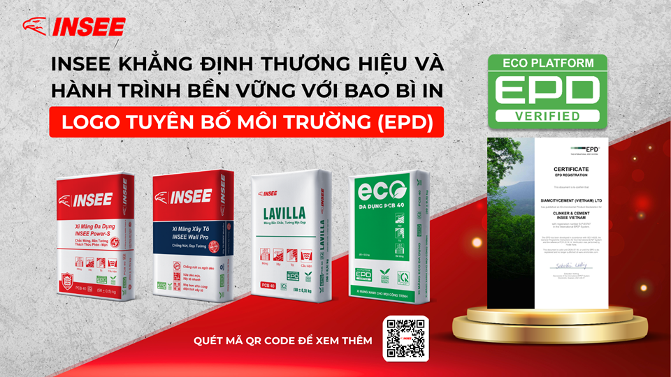 INSEE Việt Nam tự hào là doanh nghiệp sản xuất xi măng đầu tiên tại Đông Nam Á nhận chứng chỉ EPD quốc tế - Tuyên Bố Sản Phẩm Môi Trường (Environmental Product Declaration) do bên thứ ba (Metsims Limited - Oxford, Vương quốc Anh) phê duyệt và đăng ký trên Hệ thống EPD® quốc tế nhằm cung cấp thông tin minh bạch về tác động môi trường trong vòng đời của sản phẩm (LCA), tuân thủ theo tiêu chuẩn ISO14025 và EN 15804:2012+A2:2019. Điều này chứng minh sự minh bạch không chỉ trong cam kết mà còn thể hiện rõ trong từng hành động của INSEE đến với khách hàng và cộng đồng.
