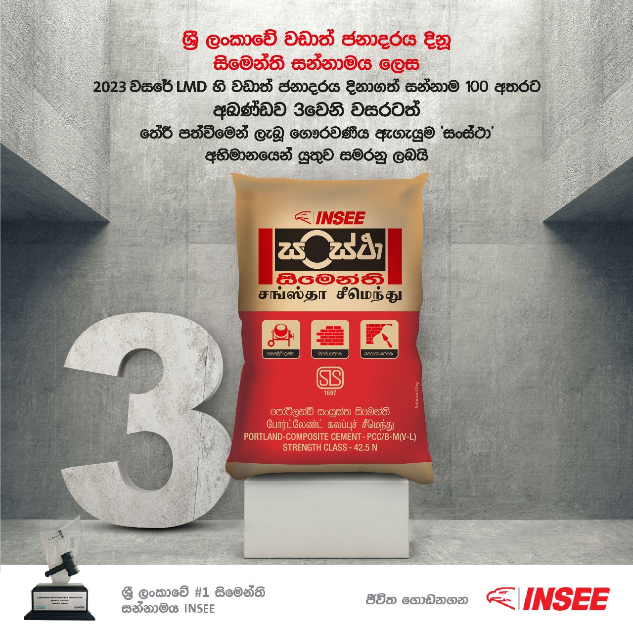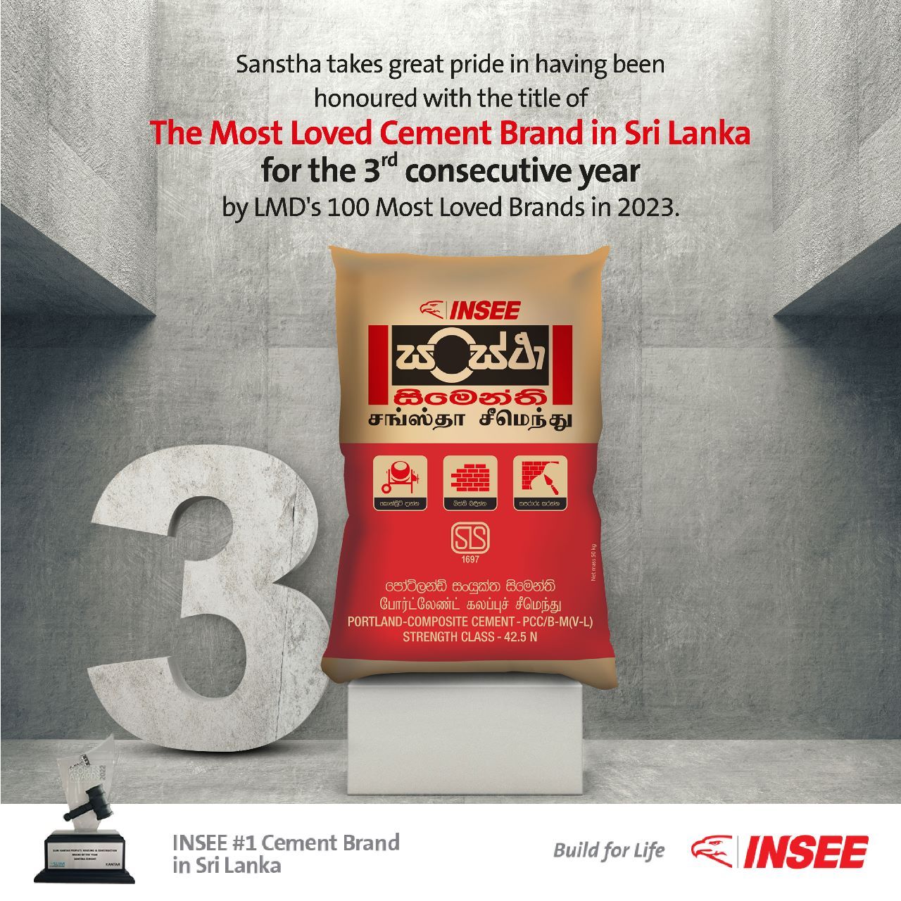 Sri Lanka’s first-ever superior blended cement product and the country’s oldest existing cement brand, INSEE Sanstha has been ranked amongst Sri Lanka’s 100 Most Loved Brands by LMD’s Brands Annual ranking for the third consecutive time.