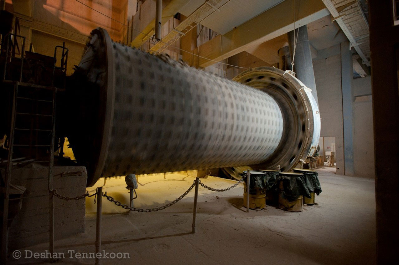 Limestone and additive (laterite) are placed in the feeding hoppers from the storage yard. Raw materials are ground using ball mills, which are rotating drum-shaped chambers with durable liners inside. The exhaust gas from the kiln serves as an energy source for drying the materials during grinding and as a carrier gas for transporting the ground material.