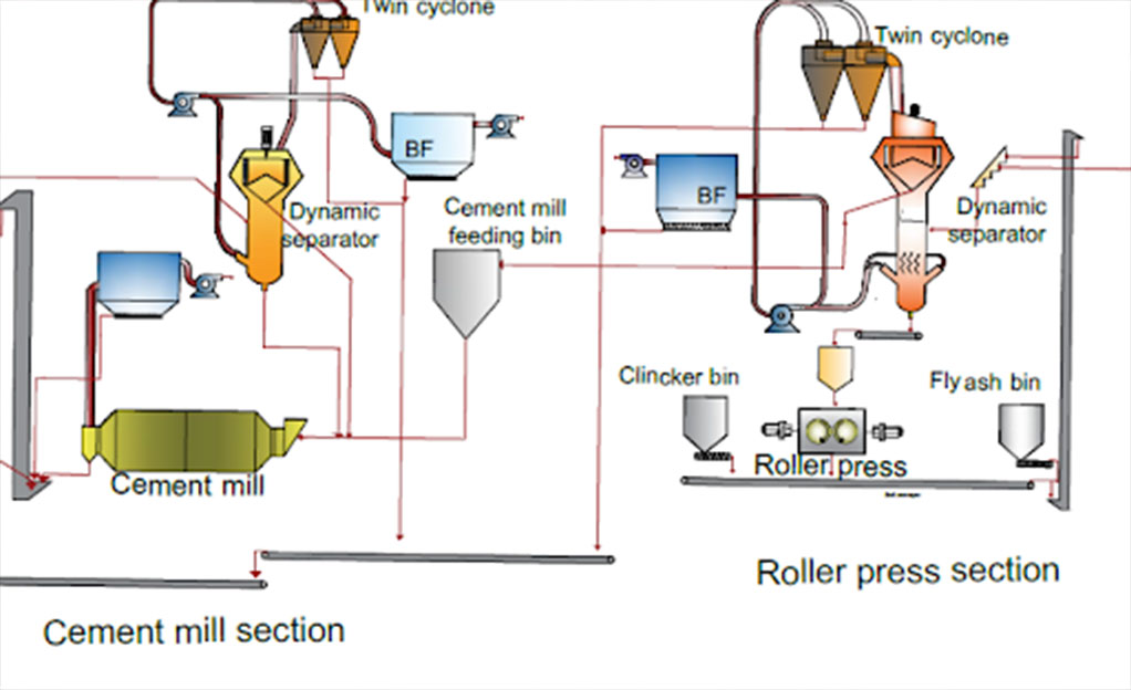 Clinker stored in the clinker yard is fed to a roller press unit along with a combination of gypsum and a mineral component mixture (MIC). This MIC is a combination of limestone and fly ash and the proportions of each depend on what type of cement needs to be produced. Once the material is fed into the roller press unit, some of the larger particles are moved to horizontal ball mills called cement mills. The roller press acts as a pre-grinder for the cement mills, reducing the size of the particles before they are fed into them.