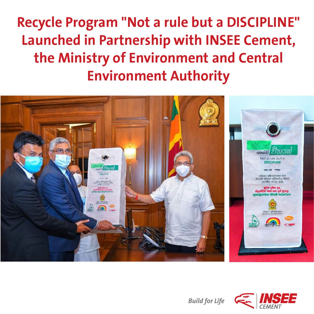 Marking the significance of the Public-Private Partnership formalized by INSEE Cement, the Ministry of Environment and Central Environment Authority, the parties presented a symbolic waste bin that will be placed in schools across the island for collection of discarded carbon pens and toothbrushes to His excellency Gotabaya Rajapaksa, President of Sri Lanka yesterday.
