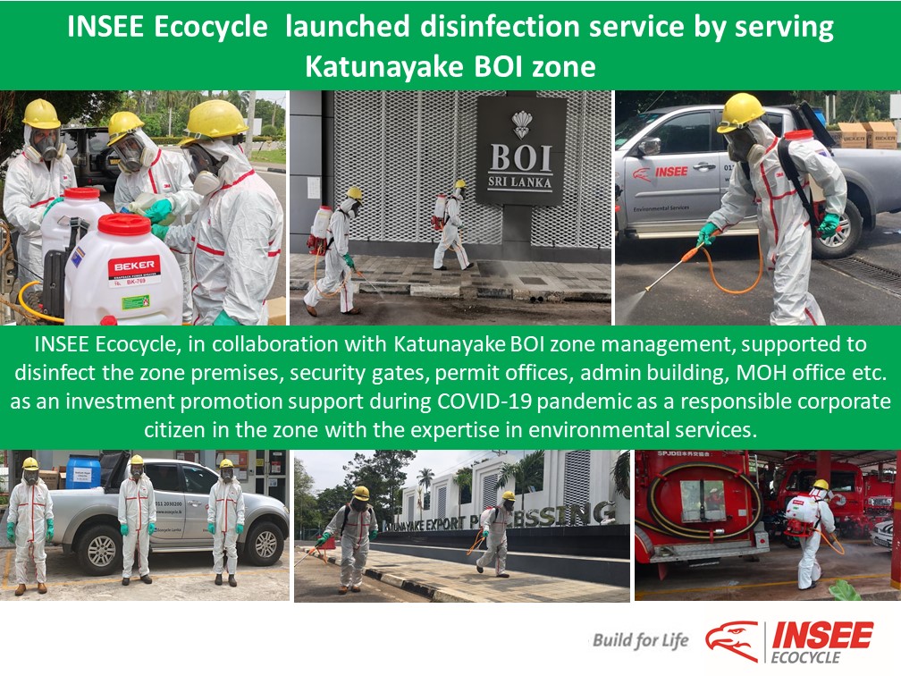 INSEE Ecocycle, in collaboration with Katunayake BOI zone management, supported to disinfect the zone premises, security gates, permit offices, admin building, MOH office etc. as an investment promotion support during the COVID-19 pandemic as a responsible corporate citizen in the zone with the expertise in environmental services.