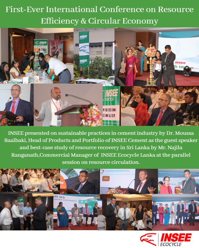 INSEE presented at the first-ever International Conference on Resource Efficiency & Circular Economy as a responsible corporate contributing to a circular economy focusing on sustainable practices in cement industry by Dr.Moussa Baalbaki, Head of Products and Portfolio of INSEE Cement as the guest speaker and best-case study of resource recovery in Sri Lanka by Mr.Najila Ranganath, Commercial Manager of INSEE Ecocycle Lanka at the parallel session on resource circulation.
