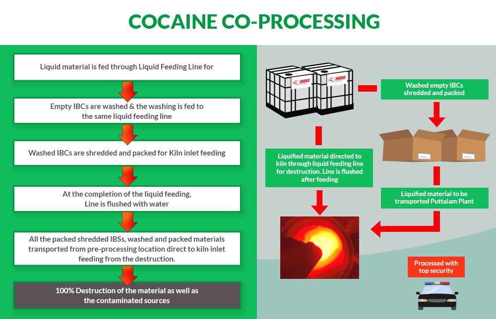 The confiscated Cocaine is liquified in an aqueous medium to ensure that this material is completely disposed of through a liquid line rather than through a solid feeding line. The pre-processing involves a conversion of the chemical structure and the physical state of the material. As per the calculated ratios in pre-trials, the material is dissolved in water ensuring zero residual remains. For visual differentiation of the material, a coloring agent is added. Pre-processing is done under high security to prevent re-production of Cocaine through neutralization.