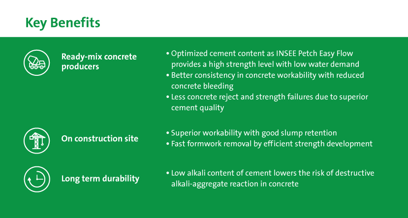 INSEE Petch Easy Flow is a high-performance hydraulic cement that combines superior workability with high strength development. It is designed to meet all concrete requirements while being more environmentally friendly with lower CO2 emissions.
