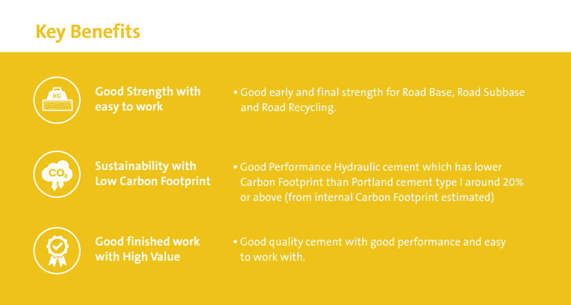 INSEE Petch Ngarn Thang Luang is a good performance cement which is designed to provide satisfied performance of Road Base, Road Subbase and Road Recycling application requirement and specification. In addition, INSEE Petch Ngarn Thang Luang is Hydraulic Cement which has Low Carbon Emission, so INSEE Petch Ngarn Thang Luang is a good performance cement for both Engineering requirement and Sustainability.