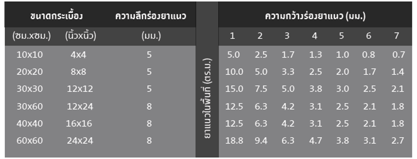 1 Kg of INSEE TileGrout Go (1 bag) per 0.38 liters water or INSEE TileGrout Go 2.6 parts per 1 part of water can cover the area as shown on below table