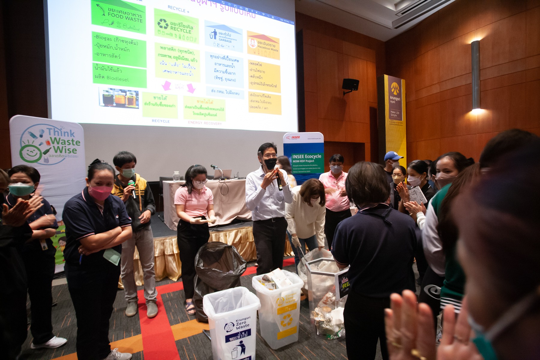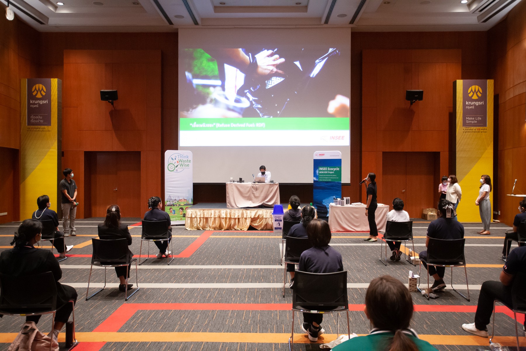 To prepare for RDF drop-off points project, Krungsri hosted the training for all office maids which are a key person to help monitor and segregate waste before sending to INSEE Ecocycle platform. In the training session, attendees will learn the impact from waste problems, identify waste that can produce as RDF and separate RDF waste from general waste.