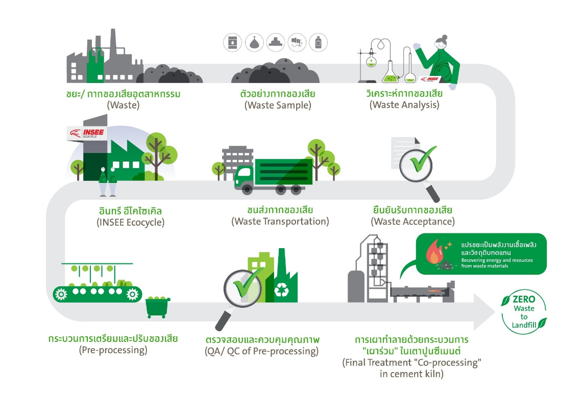 “การเผาร่วมในเตาปูนซีเมนต์ (Co-processing) เป็นที่ยอมรับอย่างกว้างขวางว่าเป็นหนึ่งในแนวทางการจัดการของเสียที่ยั่งยืนที่สุด โดยกระบวนการ การจัดการของเสียเบื้องต้นและการเผาร่วมในเตาปูนซีเมนต์ จัดอยู่ในหมวดของ การรีไซเคิลแร่ธาตุ (Mineral Recycling) และ การนำพลังงานความร้อนกลับมาใช้ใหม่ (Energy Recovery)””