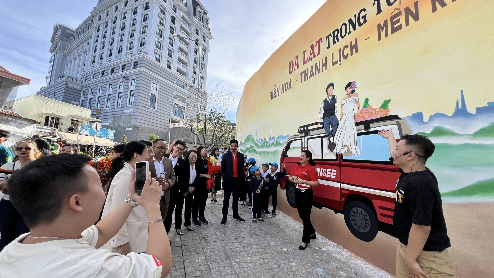 On the morning of December 15, 2023, the handover ceremony of the artwall “Shades of Dalat”, which spans over 130 meters, was warmly welcomed by representatives of the local authorities. Immersed in the festive atmosphere commemorating the 130th anniversary of the city's establishment, Ms. Tran Thi Vu Loan, Vice Chairman of the People's Committee of Dalat, expressed her thoughts at the handover ceremony: “Dalat city always strives for sustainable development with green and friendly criteria. On this occasion, the city's leadership has encouraged many community-serving projects and the artwall “Shades of Dalat” can be seen as the largest and highest-quality project, with harmonious drawings, bright colors and a truthful representation of the characteristic landscapes and culture of Dalat”.