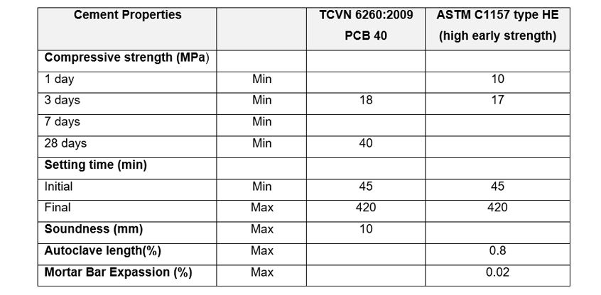 The TCVN and ASTM standards use different test methods: values are not comparable. You can obtain recent test certificates of INSEE Quick Cast upon request.