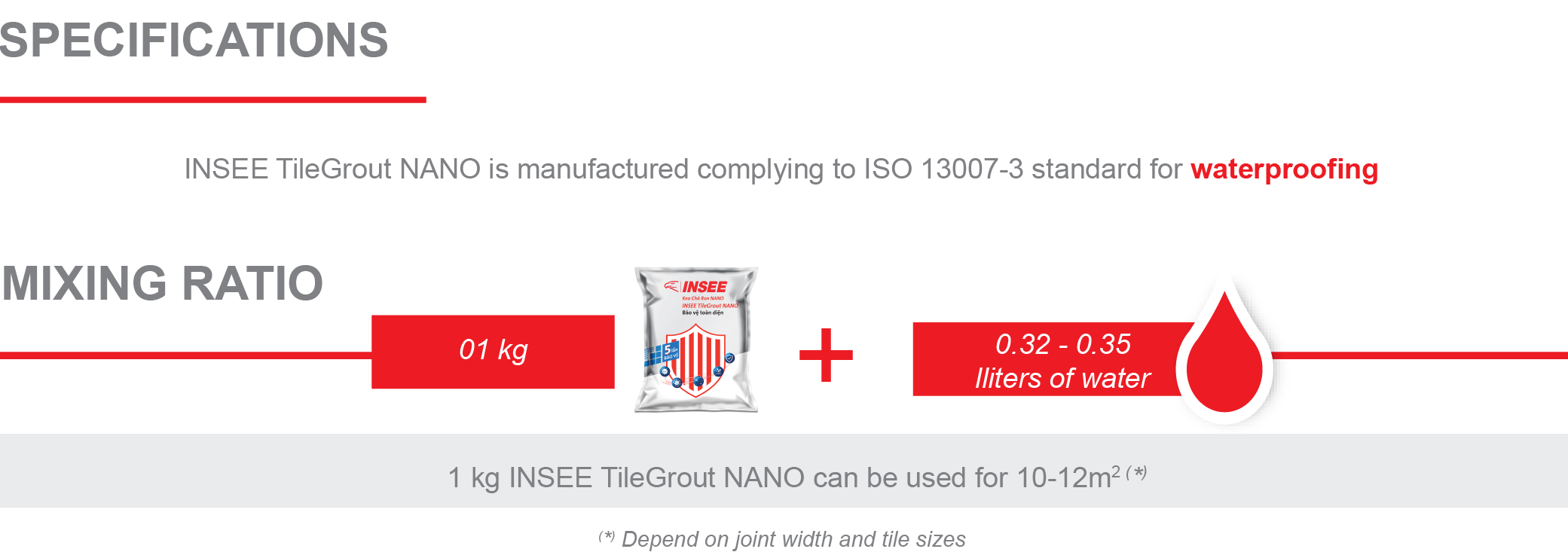 INSEE TileGrout NANO is a specialized product which complies to ISO 13007-3 (equivalent to Vietnam standards TCVN 7899-3), with the common name Ceramic tiles - Grouts and adhesives.
