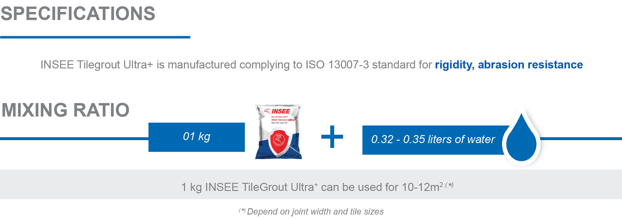 INSEE TileGrout Ultra+ is a specialized product which complies to ISO 13007-3 (equivalent to Vietnam standards TCVN 7899-3), with the common name ceramic tiles - Grouts and adhesives.