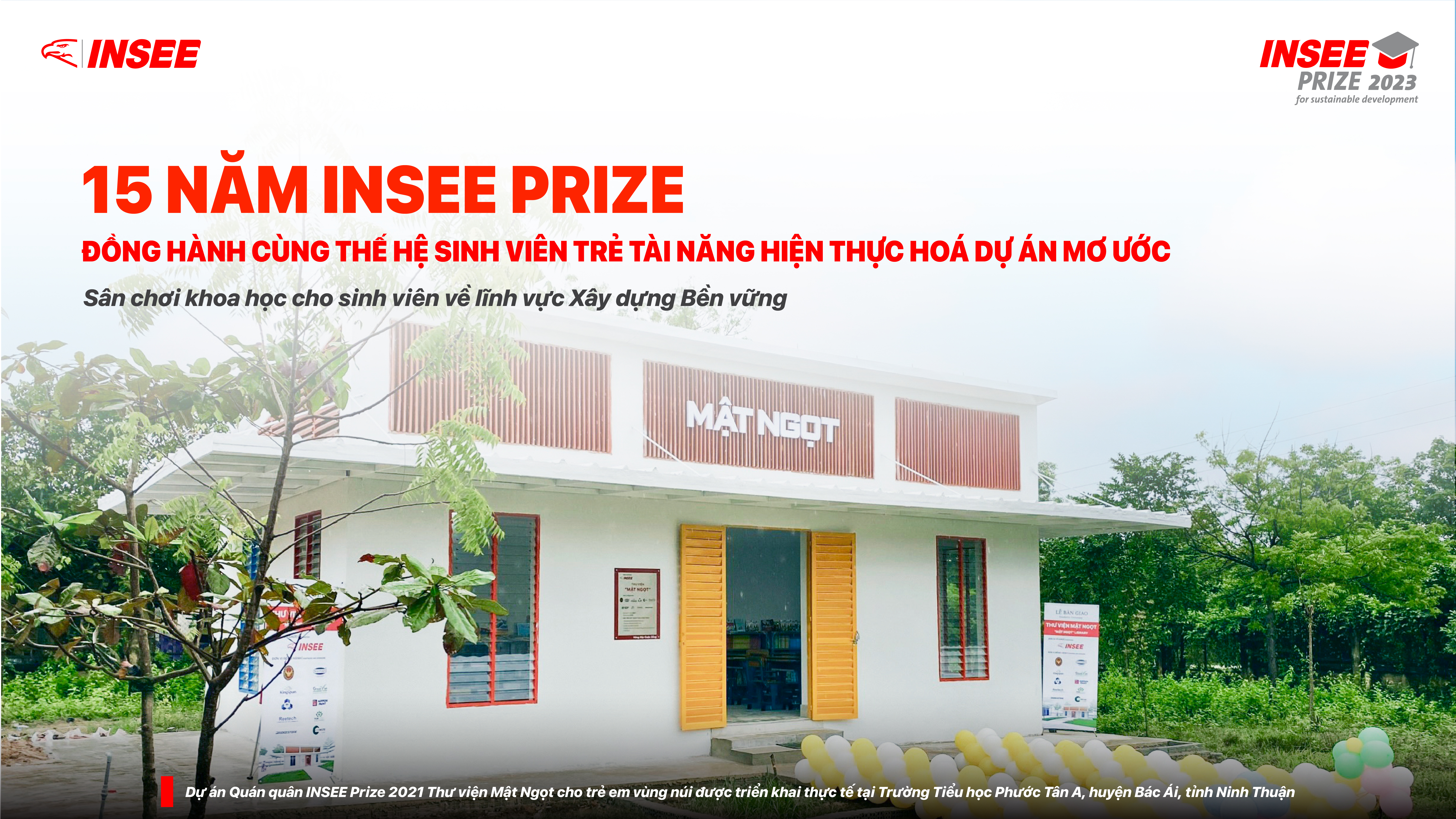 Sau những thành công rực rỡ của các mùa INSEE Prize, năm 2023, INSEE Việt Nam chính thức khởi động một chặng đường tiếp theo của cuộc thi vào ngày 29/03/2023. Với mong muốn khơi nguồn sáng tạo của các bạn sinh viên trẻ ngành Xây dựng và Kiến trúc, từ đó xây dựng ước mơ bền vững thành hiện thực để hỗ trợ phát triển cộng đồng và tạo tiền đề vững chắc cho các thí sinh tham dự trên chặng đường phát triển nghề nghiệp tương lai, với tổng giải thưởng hơn 300 triệu đồng.