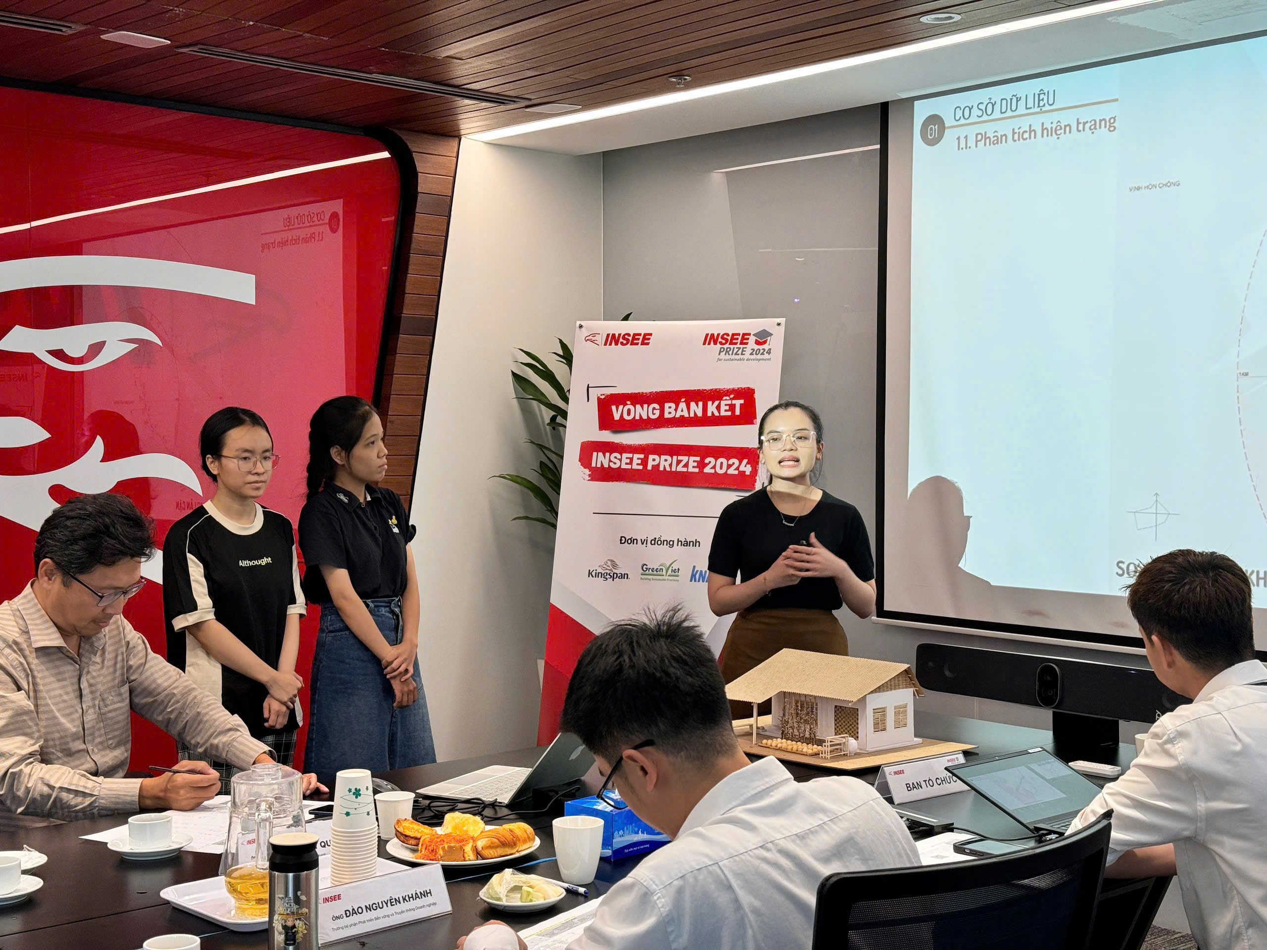 Hội đồng Ban giám khảo năm nay có sự tham gia từ Ông Hà Ngọc Anh Minh - Giám đốc Công ty TNHH Kingspan, Ông Nguyễn Hữu Mỡi - Giám đốc Nhân sự Công ty TNHH Knauf, Ông Đỗ Hữu Nhật Quang - Giám đốc Phát triển Kinh doanh Công ty TNHH Tư vấn Công trình xanh GreenViet và Ông Đào Nguyên Khánh - Trưởng Bộ phận Phát triển Bền vững & Truyền thông Doanh nghiệp INSEE Việt Nam. Sau buổi trình bày Vòng Bán kết INSEE Prize 2024, Ban giám khảo nhận xét tổng thể các đề tài năm nay được các bạn sinh viên đầu tư về mặt tổng thể dự án và ý nghĩa cộng đồng, giải pháp kiến trúc phù hợp với địa điểm thực hiện cũng như tối ưu được những vật liệu bền vững cho công trình.