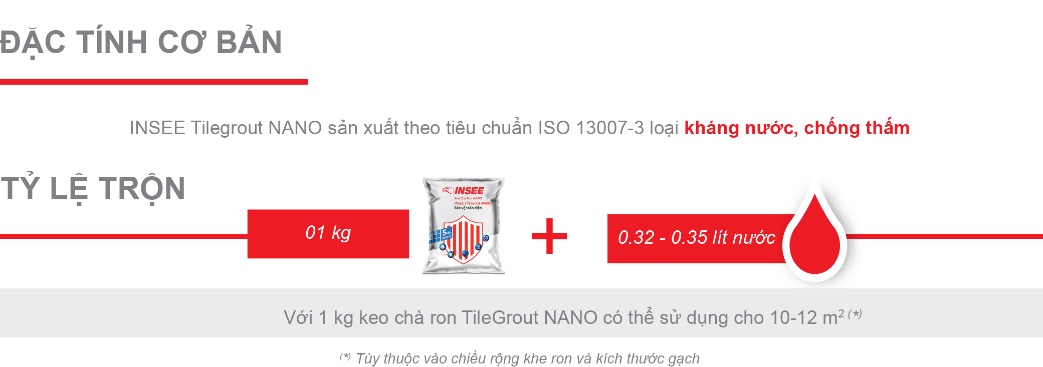 INSEE TileGrout NANO là sản phẩm keo chà ron chuyên dụng, đáp ứng bộ tiêu chuẩn ISO 13007-3 (hoàn toàn tương đương TCVN 7899-3), với tên gọi chung là Gạch gốm ốp lát - Vữa, keo chít mạch và dán gạch.