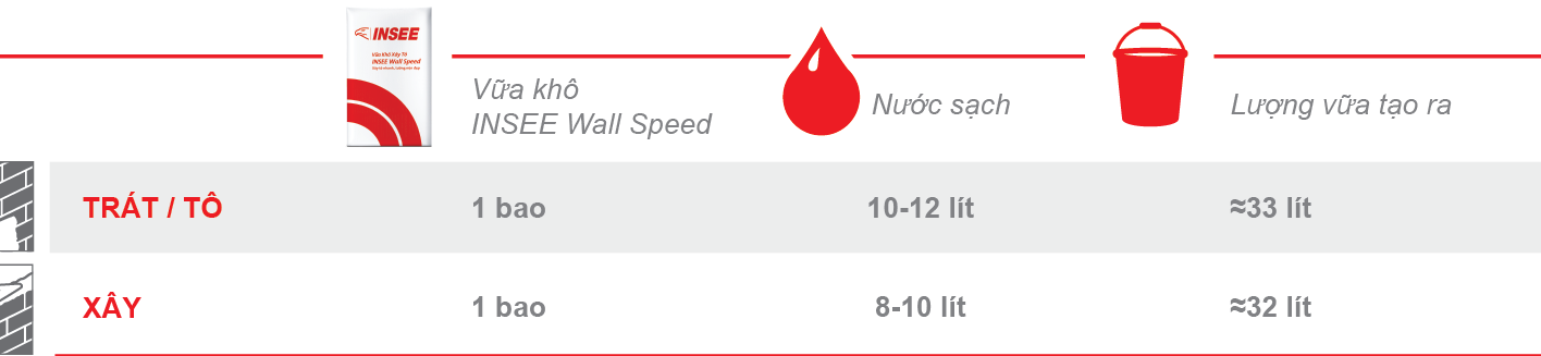 Chỉ cần trộn vữa khô xây tô INSEE Wall Speed với lượng nước sạch vừa đủ là có ngay hỗn hợp có khả năng bám dính cao, cho bề mặt tường hoàn thiện láng mịn và hạn chế rạn nứt.